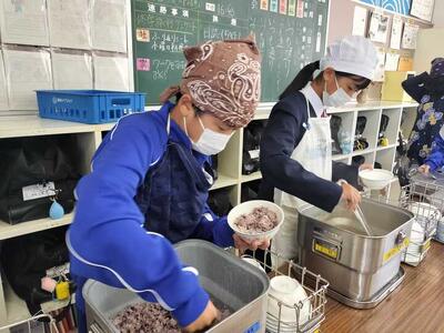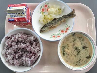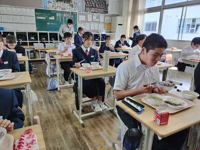 「しこくまいごはん」は、果皮や種皮に含まれるアントシアニンにより、白米と混ぜて炊くと鮮やかな紫色になり、「しこくまい(紫黒米)ごはん」と呼ばれます。味はもちろんのこと、見た目も楽しむことができました。具だくさんで栄養たっぷりの「みそしる」、小さな体にうまみがぎゅっと詰まった「あまごのからあげ」、甘酢の酸味が食欲をそそる「あまずあえ」など、どのメニューも生徒たちに大好評で、学年を問わず笑顔で給食の時間を過ごしていました。