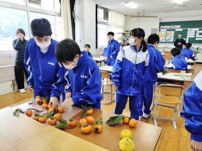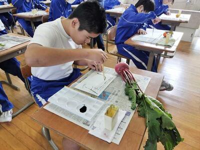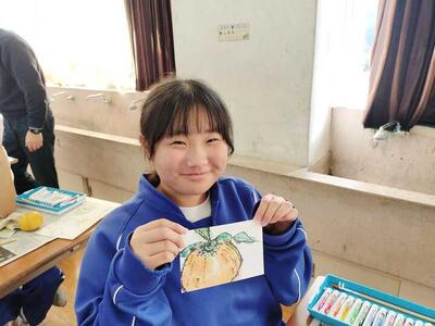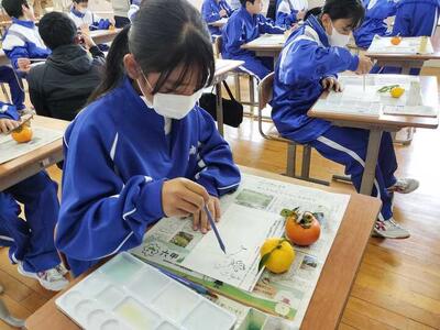 題材には、秋の実りである柿や柚子などを選んで描きました。大胆に色を乗せる生徒、細部まで丁寧に描き込む生徒など、表現の仕方には個性があふれていました。