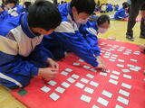 全校生徒を縦割りのグループに分け、1班5~6人で50枚の札を使って競技を行いました。今年は山崎南小学校の6年生も参加しました。対戦ごとにメンバーを入れ替えながら、全部で3回戦に挑戦しました。